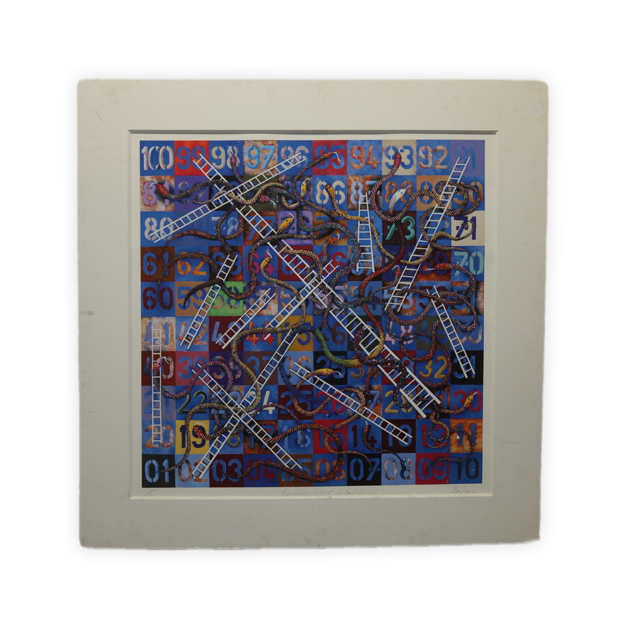 "Snakes and Ladders" presents a whimsical interpretation of the classic board game, featuring vibrant colors and playful imagery that evoke nostalgia and fun.